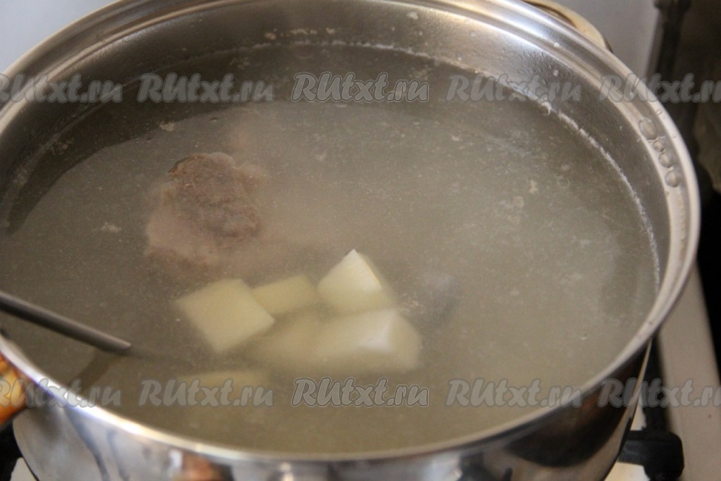 Когда наш бульон сварился, добавляем в него очищенный и нарезанный кубиками картофель.