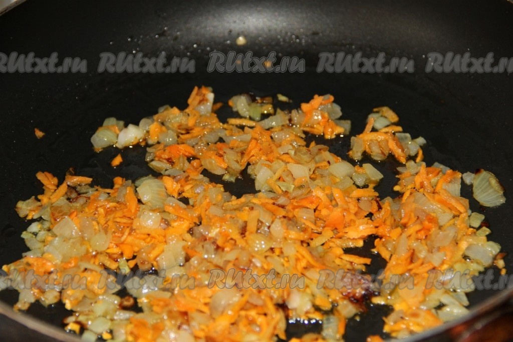 Тем временем на разогретой сковороде на растительном масле обжариваем, иногда помешивая, мелко нарезанный лук и натертую морковь до мягкости.