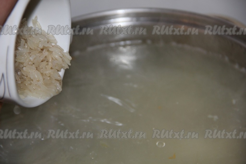 После того как закипит бульон, засыпаем промытый рис и варим на небольшом огне до готовности риса и картошки.