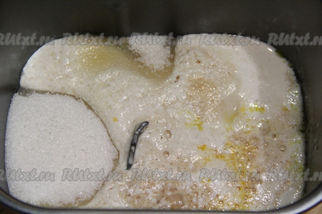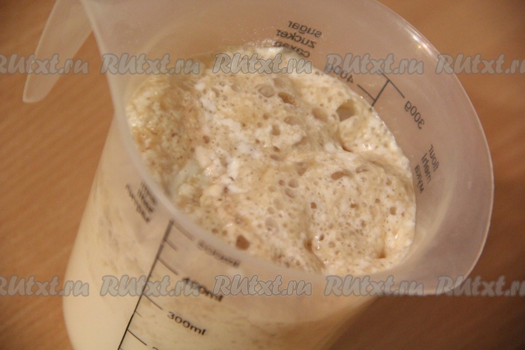 Молоко слегка подогреть. Всыпать в молоко дрожжи, 2 столовые ложки сахара, 1 столовую ложку муки. Оставить опару на 15 минут в тёплом месте. На поверхности молока появится пышная шапка.