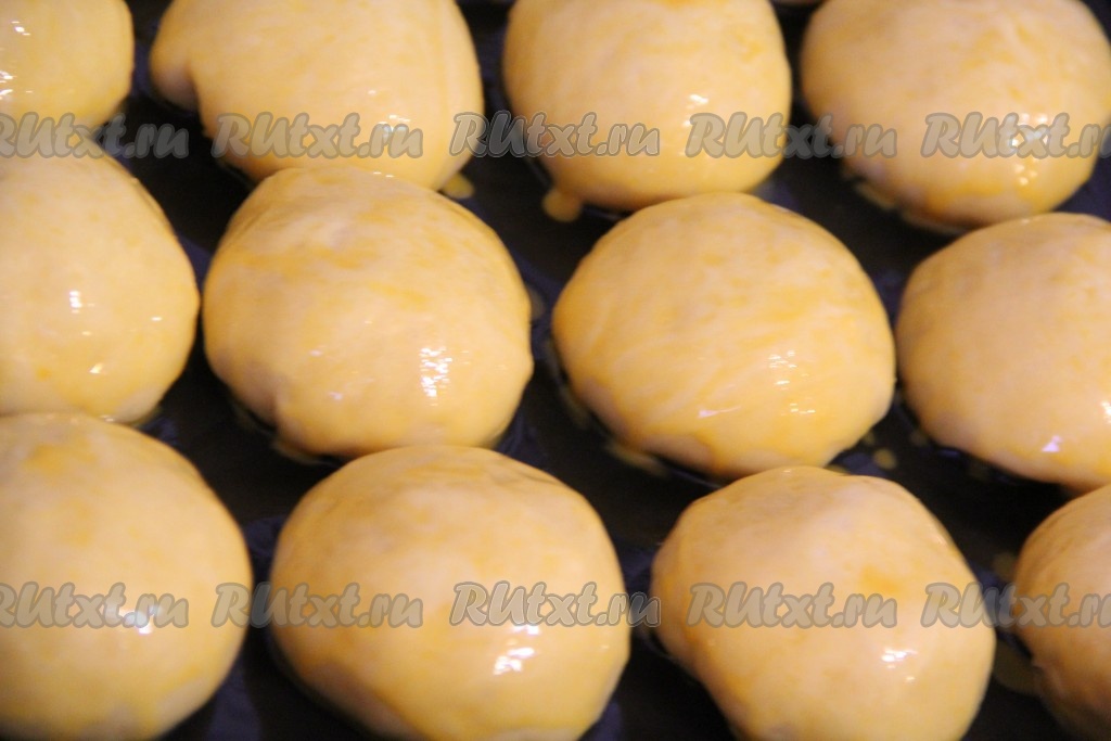 Подошедшие булочки смазать смесью из желтка и молока. Поставить в разогретую духовку и выпекать при 200 градусах примерно 25 минут, до золотистого цвета.