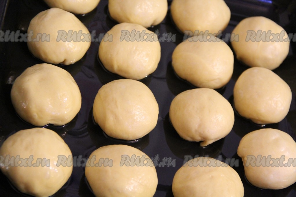 Из теста сформировать круглые булочки. Выложить их на противень, смазанный растительным маслом. Ванильные булочки нужно выкладывать на небольшом расстоянии друг от друга, с учётом, что они увеличатся в объёме. Накрыть противень с булочками полотенцем и оставить в тепле на 1 час.