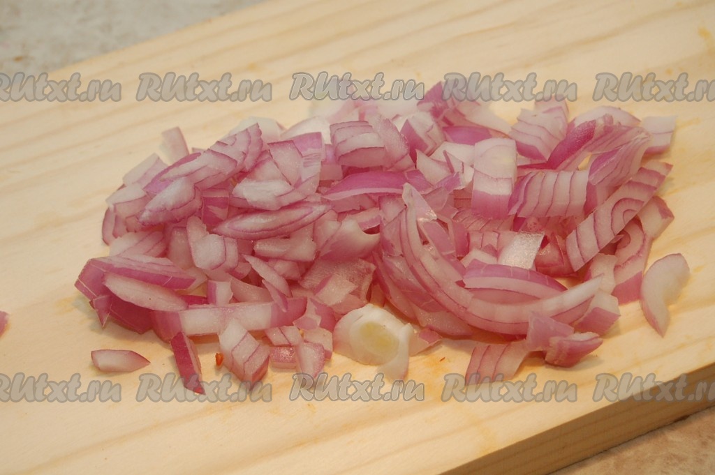 Сначала надо очистить и нарезать достаточно мелко лук. Зубчик чеснока очистить и нарезать на тонкие пластины.