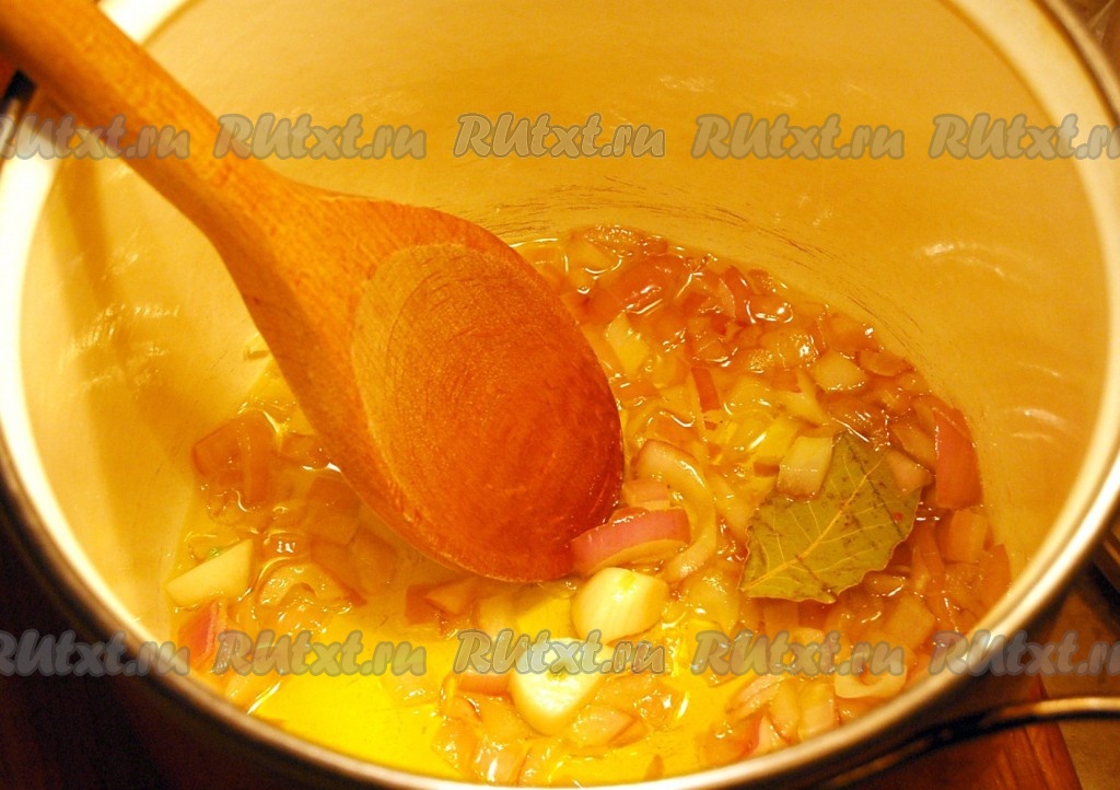 А теперь приступим к варке нашего супа с капустой и колбасой. В кастрюлю с толстым дном налить оливковое (или другое растительное) масло, выложить нарезанные лук с чесноком, лавровый лист, обжаривать минут 5 (до лёгкого чесночного запаха) на среднем огне, помешивая.