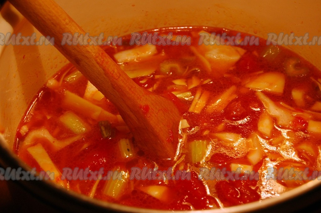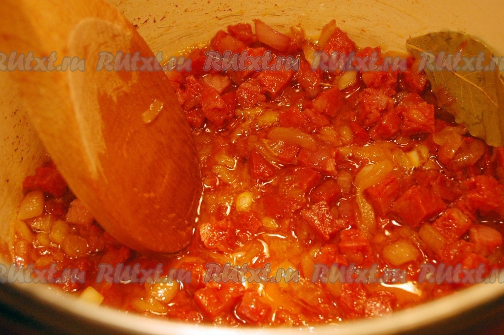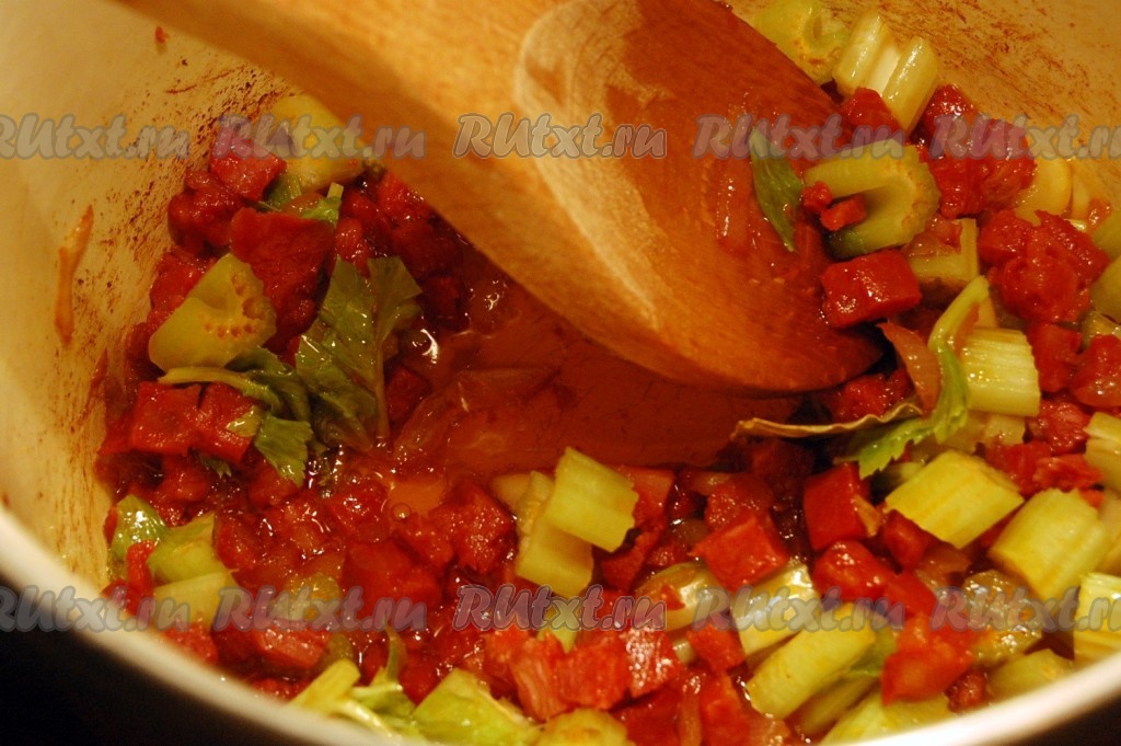 Затем добавить сельдерей и помидоры, обжаривать, помешивая, минут 5.