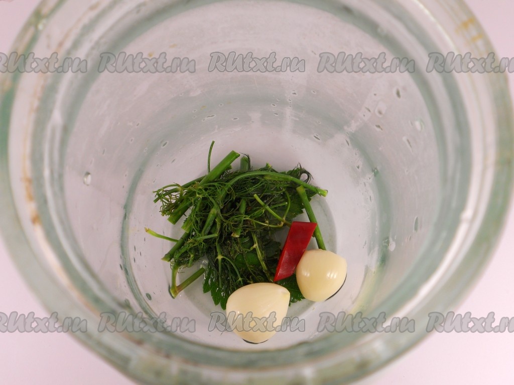 Банки хорошо вымыть и простерилизовать вместе с крышками. На дно каждой банки поместить укроп, горький перец, чеснок, листья черной смородины, предварительно окунув их в маринад.