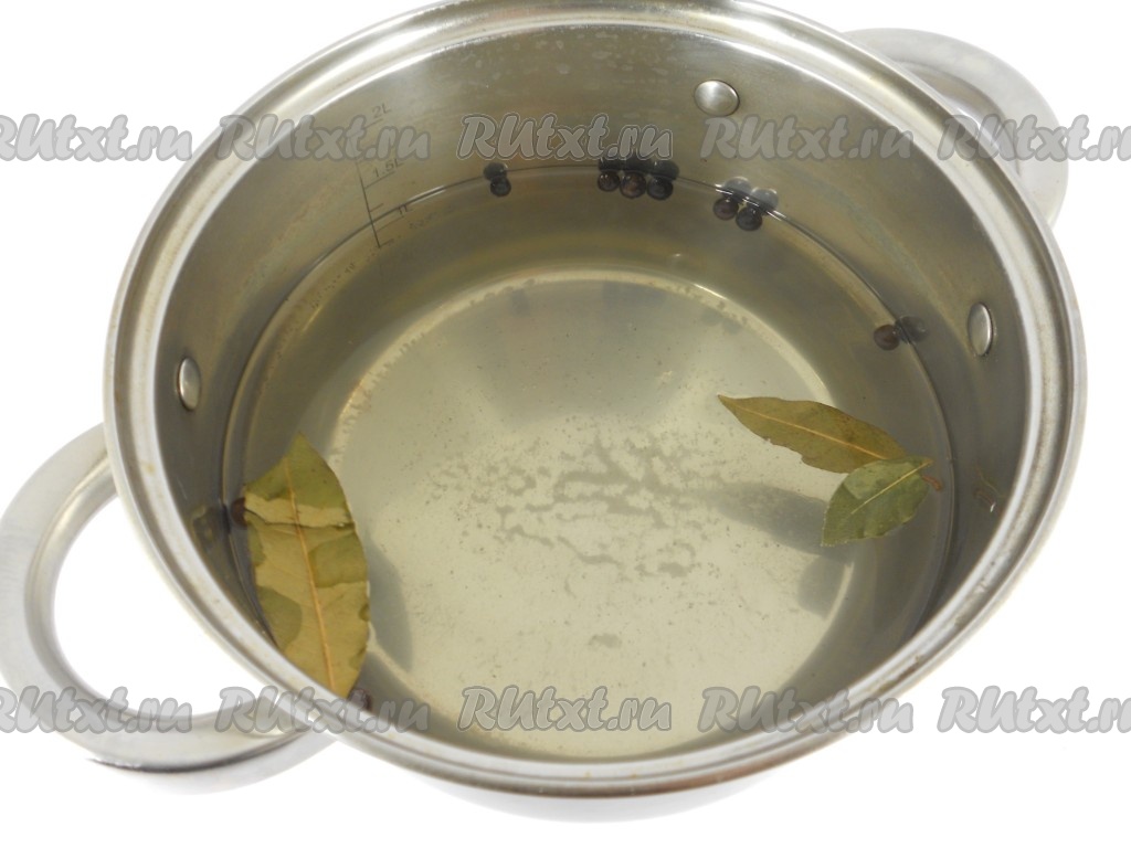 В кастрюлю налить воду, довести до кипения. Добавить соль, сахар, лавровый лист, перец горошком черный и душистый. Кипятить маринад 5 минут, после чего влить уксус.