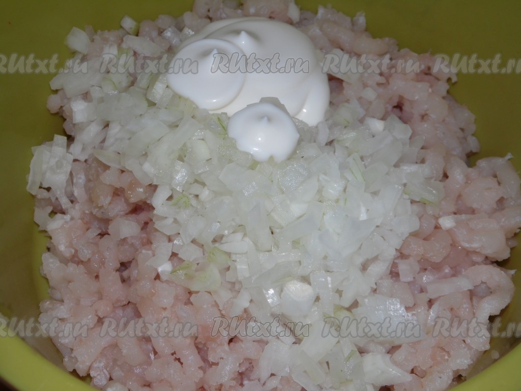 Репчатый лук очистить, нарезать мелко и добавить вместе с майонезом к рыбному фаршу.