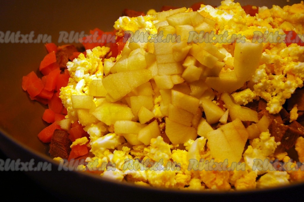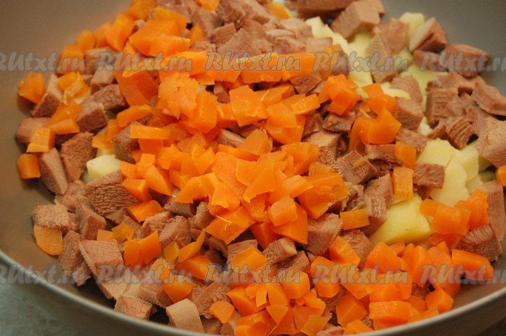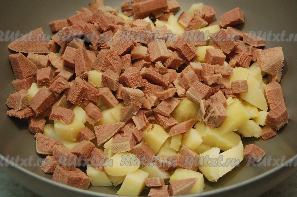 К картофелю добавляем язык, также нарезанный мелкими кубиками.