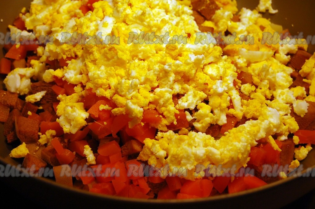Яйца, размятые вилкой, добавляем к ранее нарезанным ингредиентам.