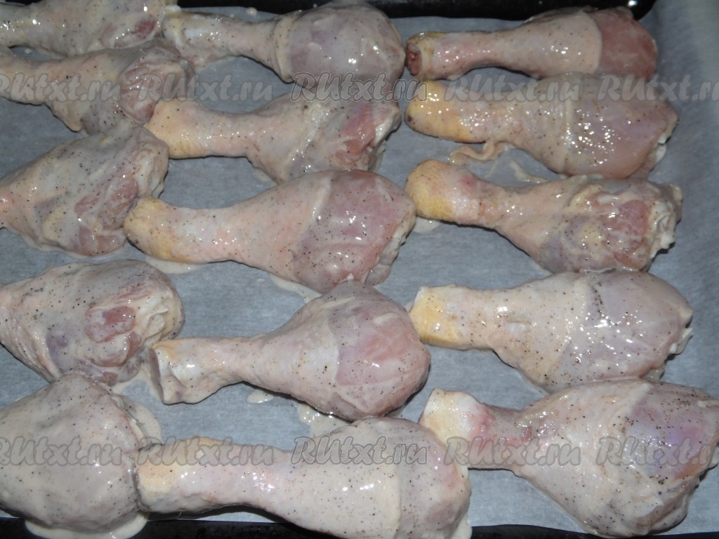 Выложить куриные голени на противень, покрытый пергаментной бумагой, и отправить в разогретую духовку при температуре 180 градусов минут на 30-40.