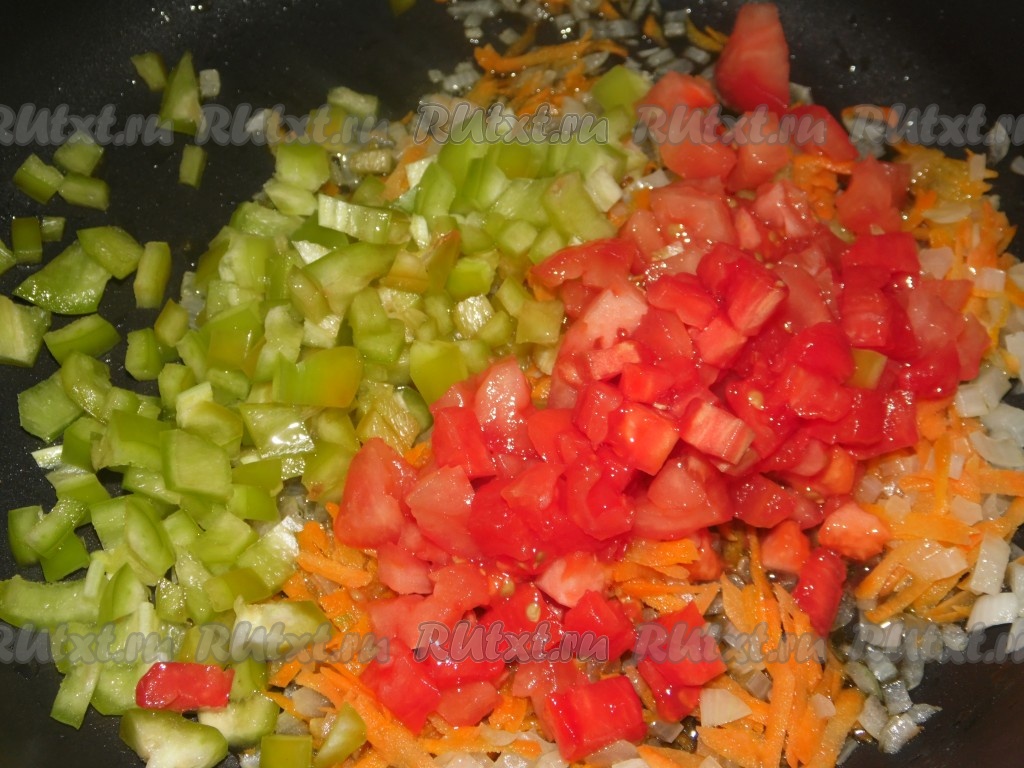 Помидоры очистить от кожицы (для этого залить помидоры крутым кипятком и кожица будет очень легко очищаться) и нарезать их на маленькие кусочки. Болгарский перец очистить от семян и нарезать на небольшие кубики. К моркови с луком добавить нарезанные помидоры с болгарским перцем и обжаривать минут 5-10, иногда помешивая.