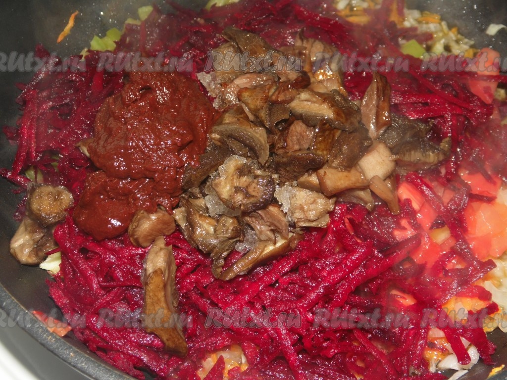 Грибы сварить до готовности, в течение минут 30, периодически снимая пену, отжать от лишней жидкости. Свеклу очистить и натереть на крупной тёрке. Добавить натёртую свеклу, грибы, томатную пасту, соль, пропущенный через пресс чеснок и специи на сковороду с морковью и луком. И томить под крышкой на маленьком огне минут 10-15.