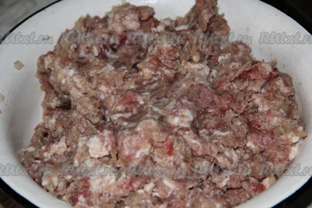 Фарш и лук пропускаем через мясорубку, солим, перчим и хорошо перемешиваем.