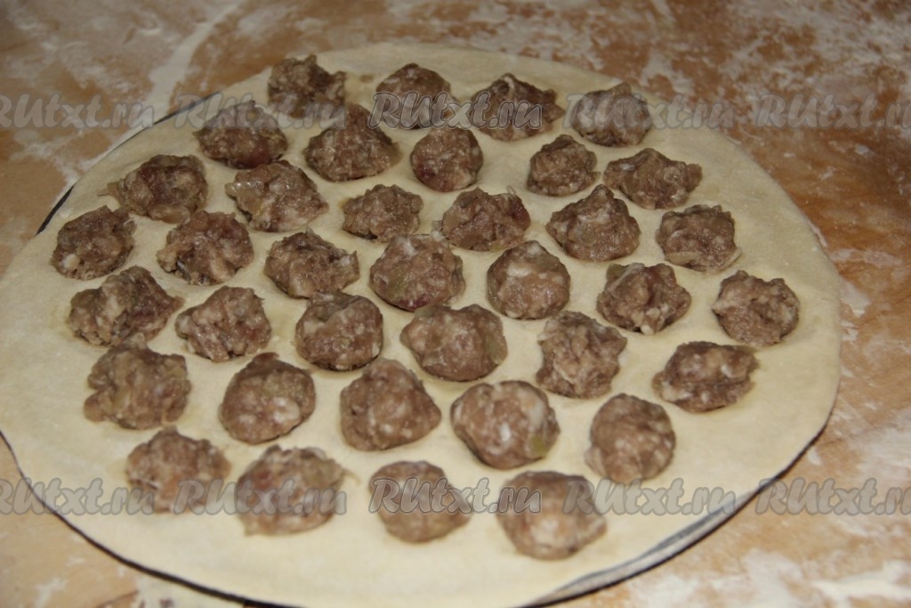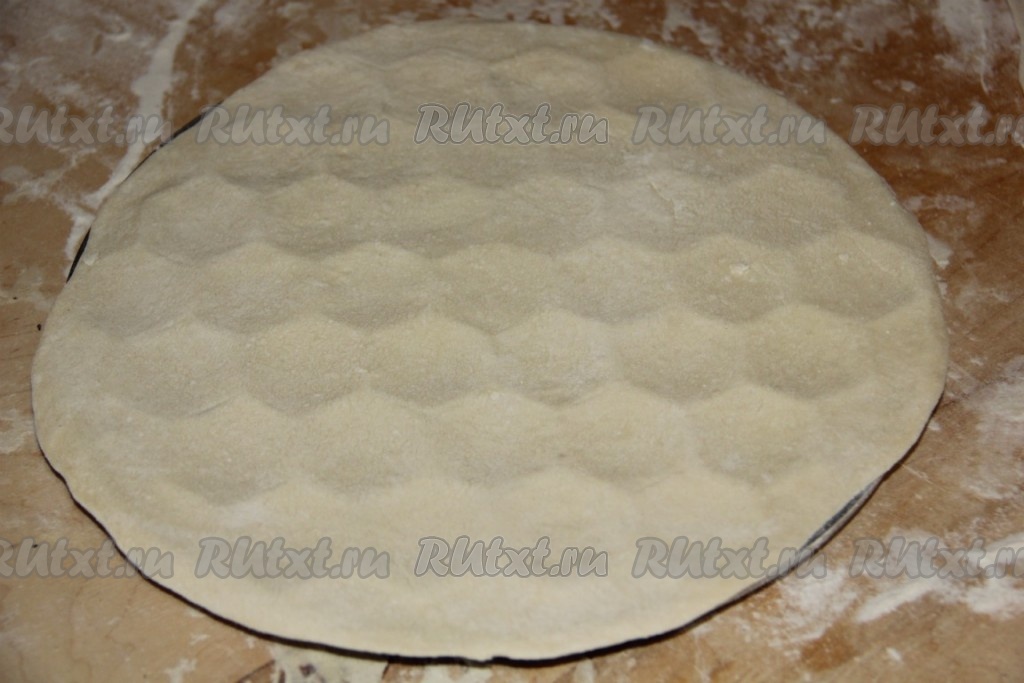 Тесто делим на равные части. Из одной части теста раскатываем достаточно тонко круг диаметром с пельменницу. Совсем тонко раскатывать тесто не нужно. Выкладываем раскатанное тесто на пельменницу и слегка придавливаем ладонями, чтобы стали хорошо видны все ячейки.