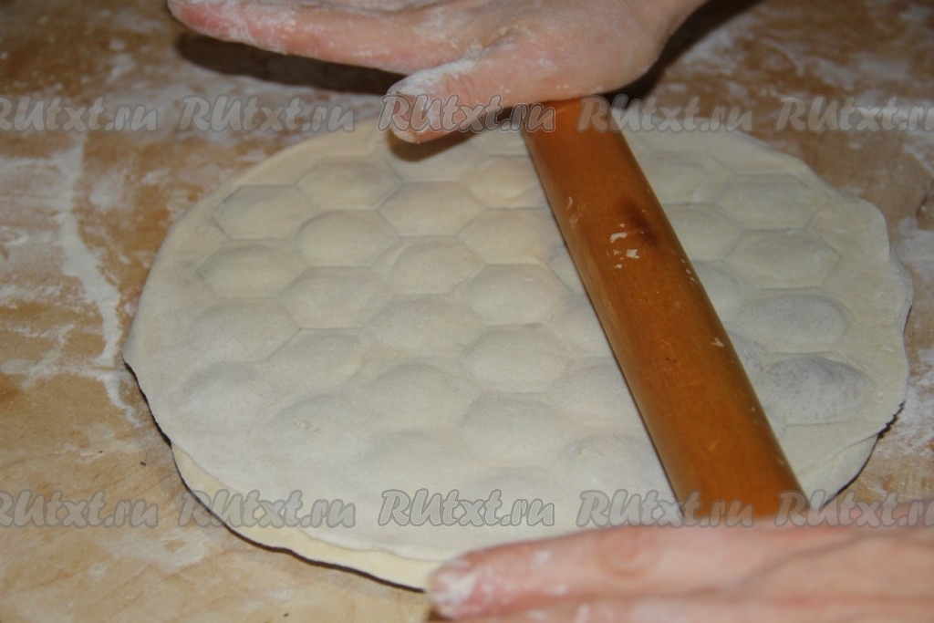 Сверху накрываем следующим раскатанным пластом теста и начинаем раскатывать тесто скалкой по пельменнице до тех пор, пока пельмени не начнут отделяться друг от друга.