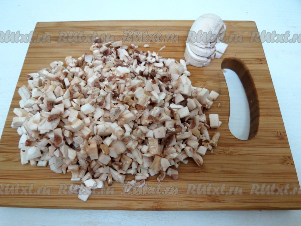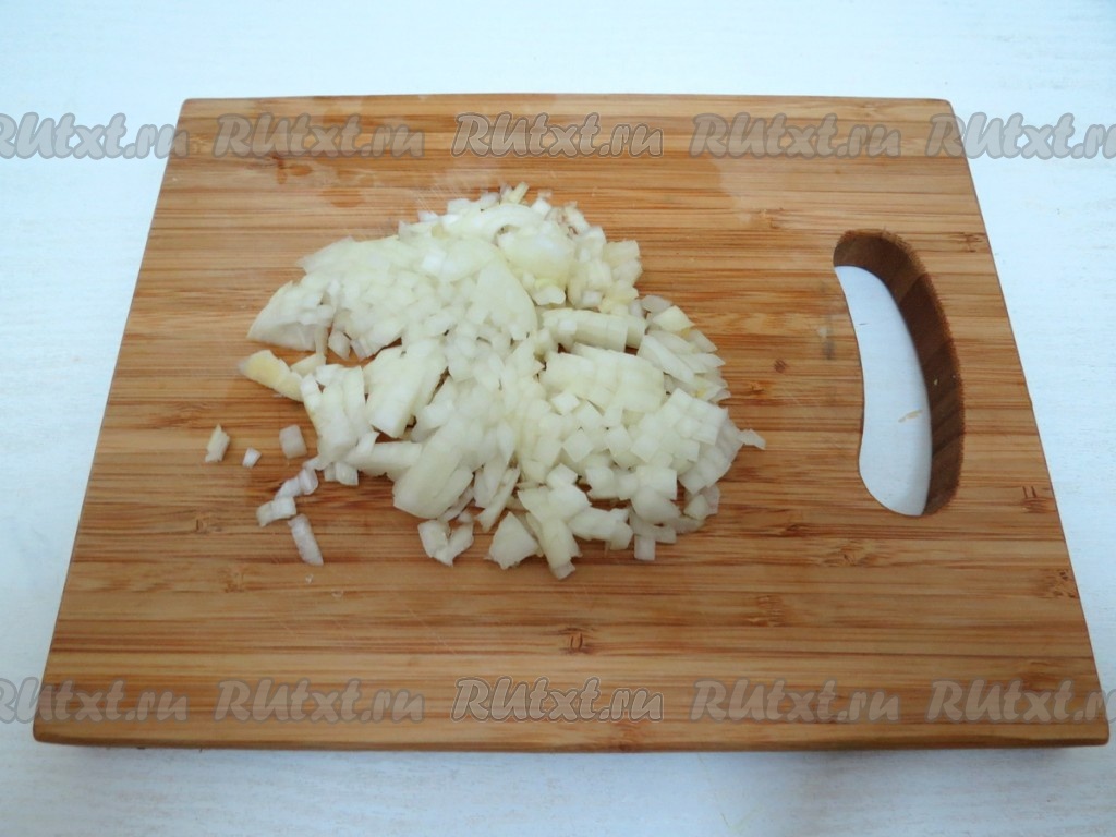 Теперь займёмся грибной начинкой. Лук очищаем и нарезаем на мелкие кубики.