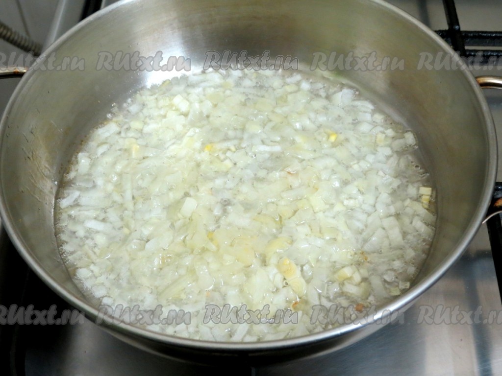 Отправляем лук обжариваться на растительном масле до прозрачности, иногда помешивая, на среднем огне.