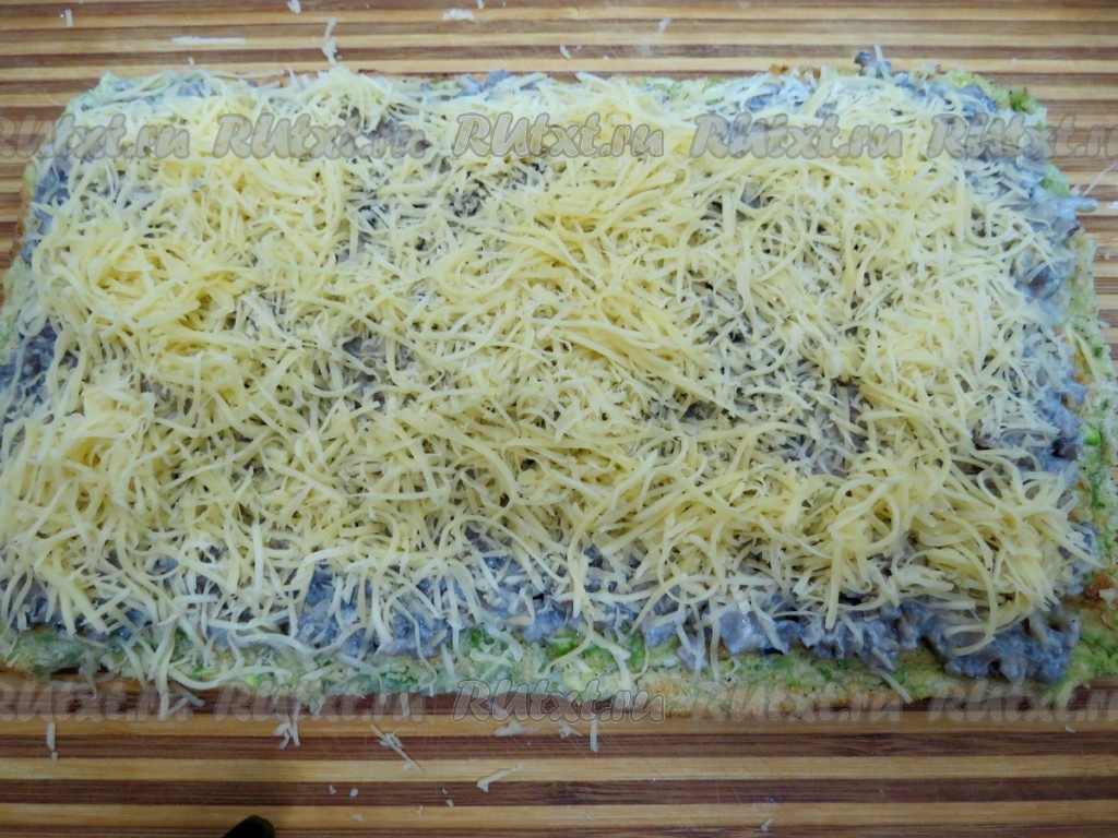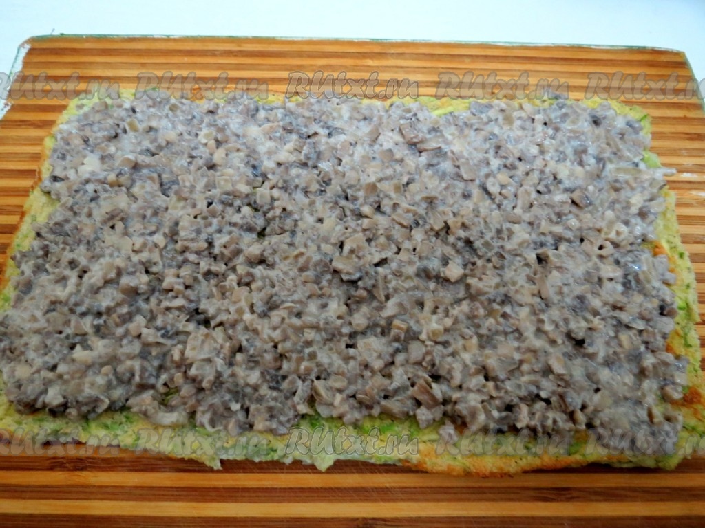 На кабачковый корж выкладываем остывшую грибную начинку.