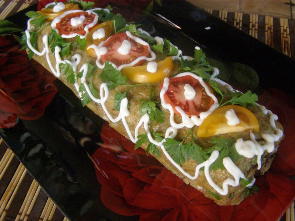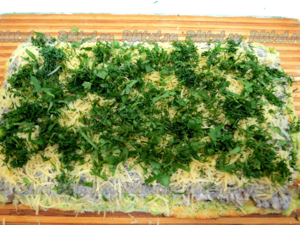 Сворачиваем кабачковый корж с грибной начинкой в рулет, начиная с широкой стороны, и украшаем по своему усмотрению. Я украсила кусочками помидора и зеленью.