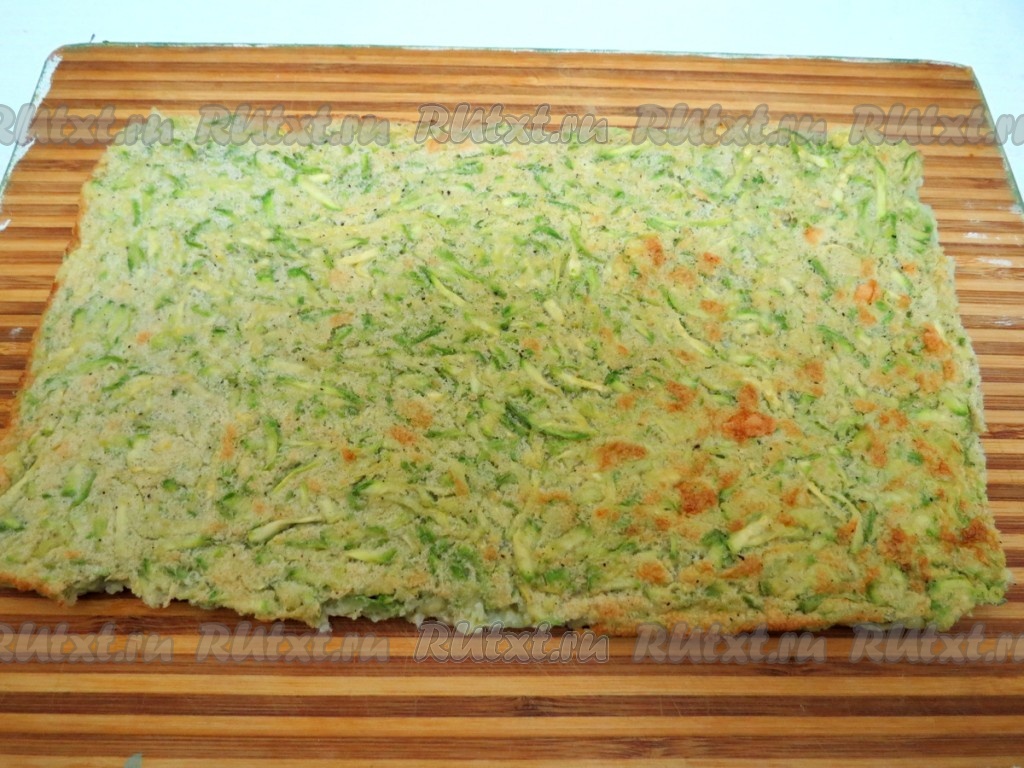 Готовый кабачковый корж вынимаем из духовки и охлаждаем на противне, затем перекладываем на доску и аккуратно снимаем бумагу для выпечки.
