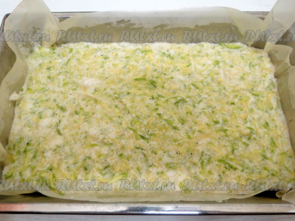 Форму для выпечки (размер моей формы 30 на 20 сантиметров) застилаем бумагой для выпечки и смазываем её маслом. Кабачковое тесто выливаем в форму, равномерно распределяем и ставим запекаться в заранее прогретую до 190 градусов духовку на 30-40 минут. Ориентируйтесь по своей духовке.