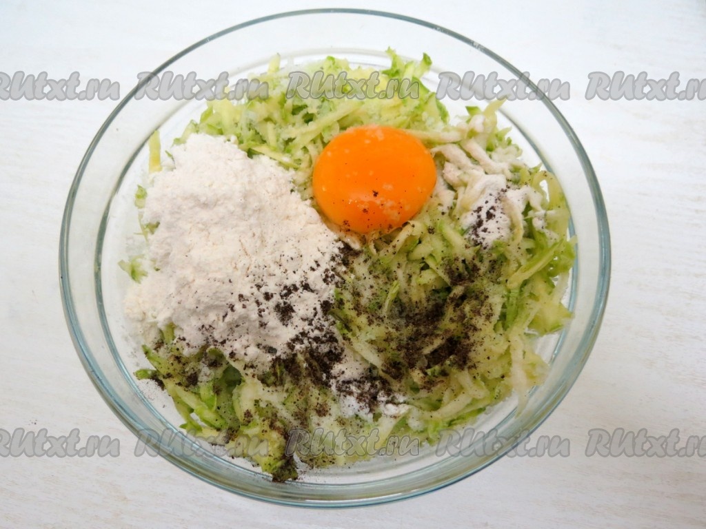 К кабачкам, отжатым от лишней жидкости, добавляем муку, яйцо, чёрный молотый перец и разрыхлитель, перемешиваем. Консистенция кабачкового теста должна напоминать густую сметану.