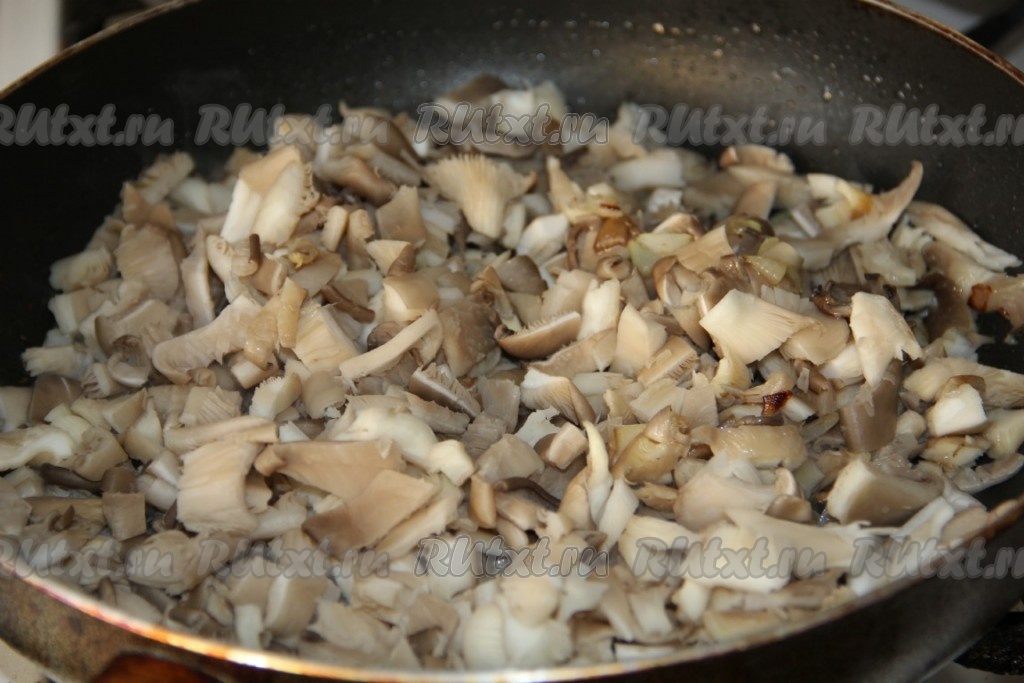 Вешенки промываем, обсушиваем и нарезаем достаточно мелко. После того как лук приобретёт золотистый оттенок, добавляем нарезанные грибы.