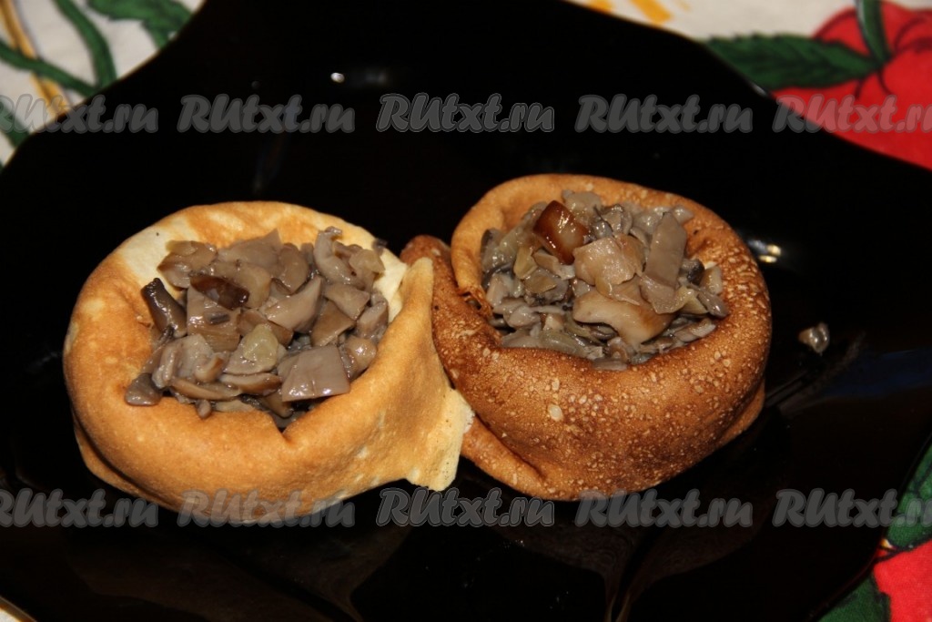 В центр наших корзиночек из блинов помещаем начинку из обжаренных грибов с луком (как на фото).