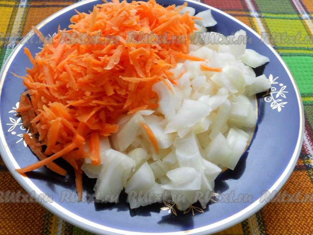 Лук репчатый нарезать небольшими кусочками, морковь натереть на крупной терке.