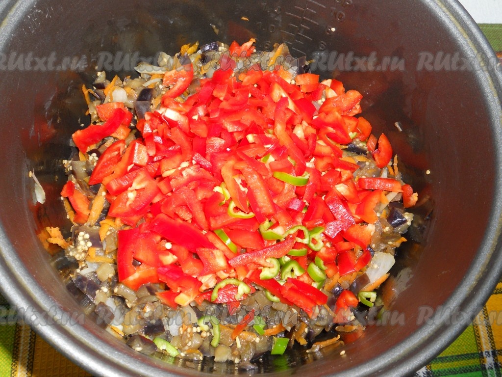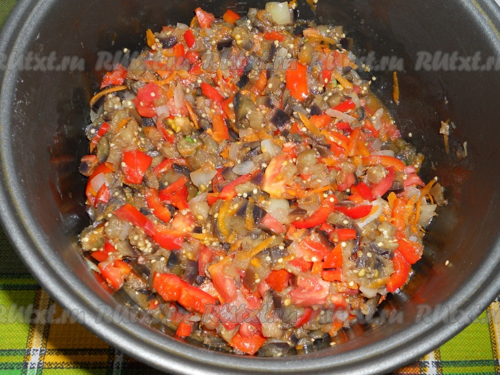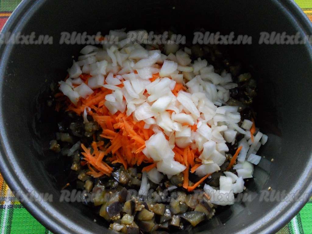 Когда баклажаны обжарятся (несколько раз в процессе приготовления надо перемешать), добавить к ним лук и морковь, перемешать. Снова выставить программу "Жарка" на 20 минут (не забывайте несколько раз перемешать).