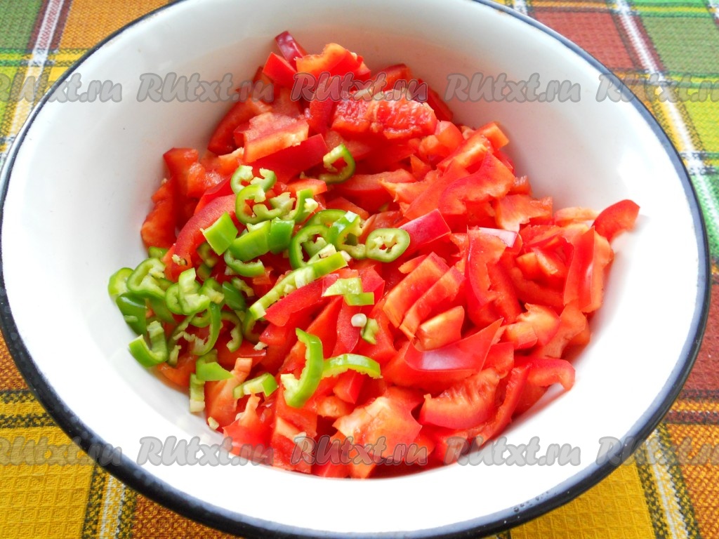 Перец болгарский сладкий нарезать некрупной соломкой, также нарезать и горький перец.