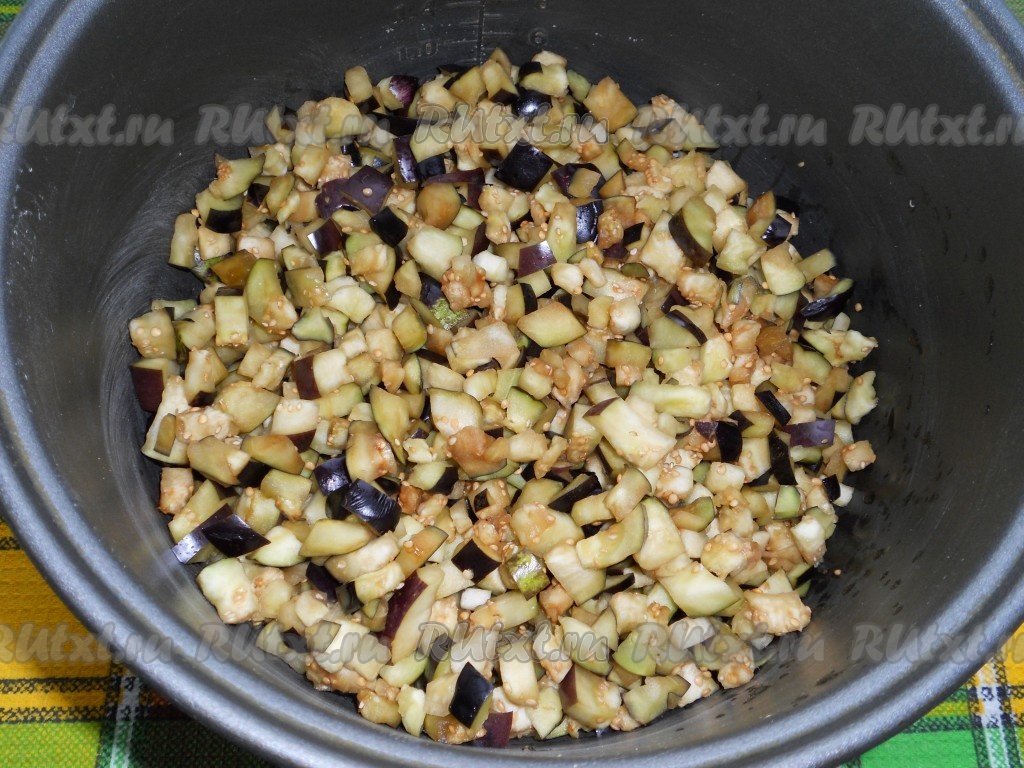 Далее в чашу мультиварки влить растительное масло и выложить баклажаны (выкладывать их следует, отжимая рукой от жидкости). Выставить программу "Жарка" на 15 минут.