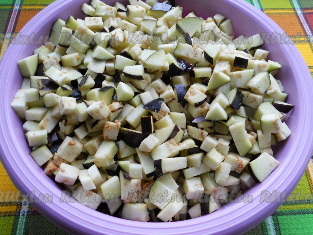 Баклажаны нарезать маленькими кубиками, хорошенько посолить их и оставить на 30 минут.