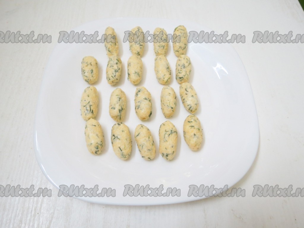 Из получившейся массы скатываем небольшие овалы длиной приблизительно 5,5 см и радиусом 2 см и отправляем их в морозильную камеру. Используем по мере надобности.