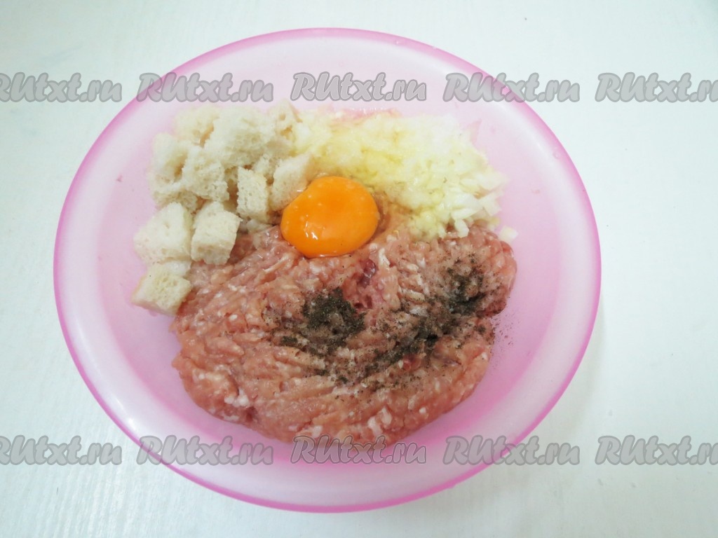 Соединяем фарш, 1 яйцо, сухари, лук, соль и перец. Тщательно перемешиваем.