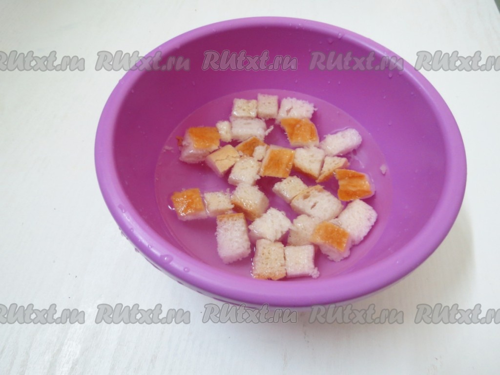 Сухарики заливаем холодной водой. Когда они станут мягкими, воду сливаем, а сухарики отжимаем от воды.
