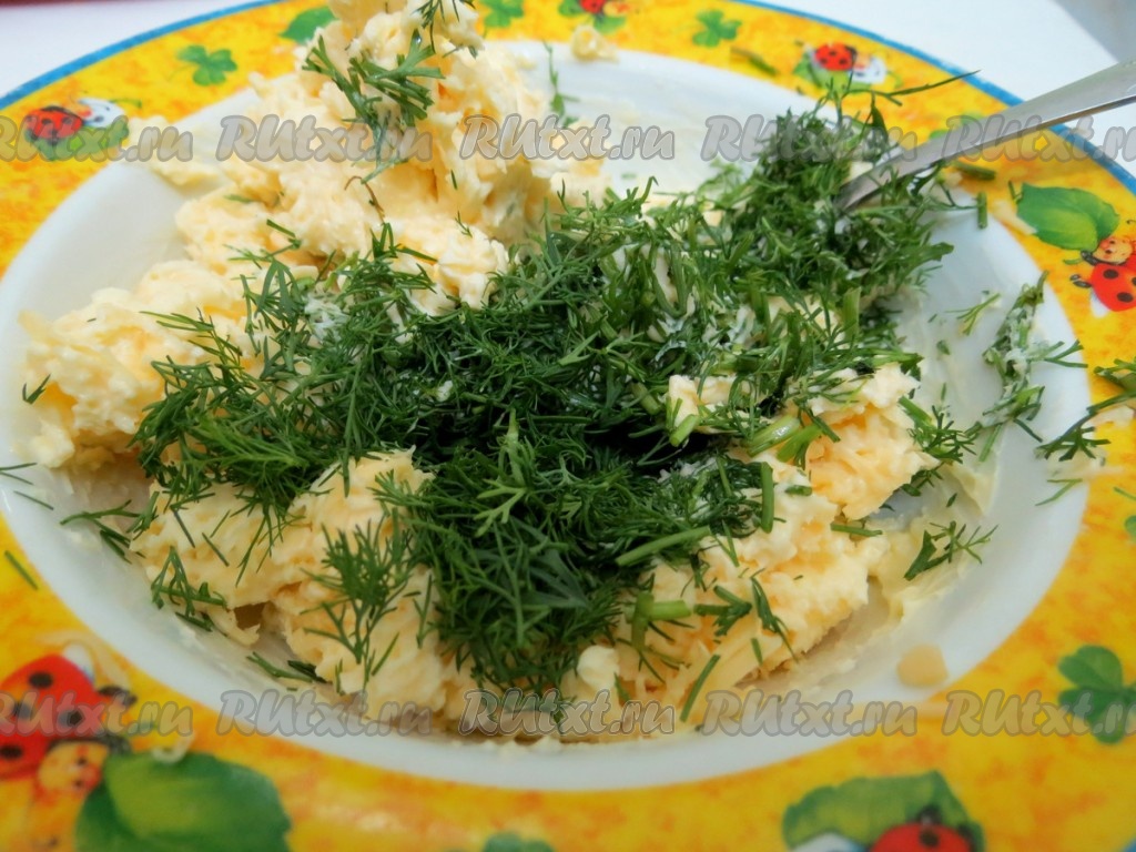 Соединяем при помощи вилки мелко нарезанный укроп, сыр и масло.