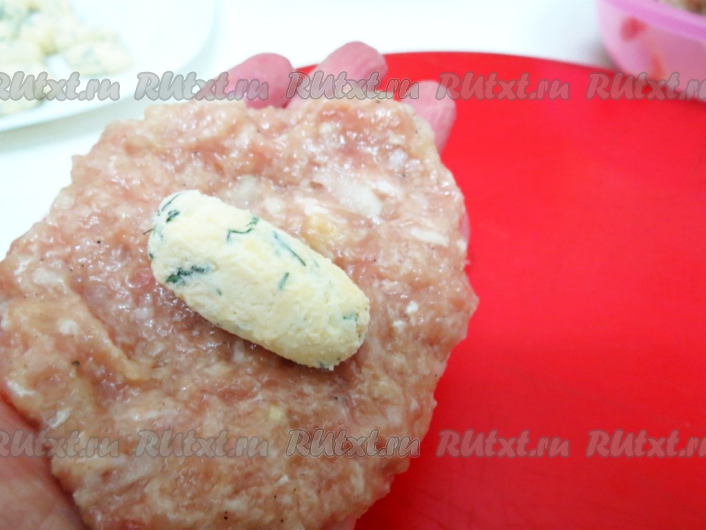 Разделываем получившуюся мясную массу на порционные кусочки. Берём один кусочек в ладошку и распределяем по ней. В центр выкладываем начинку и заворачиваем её.