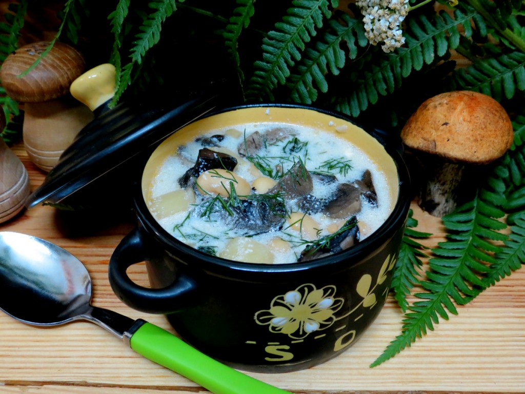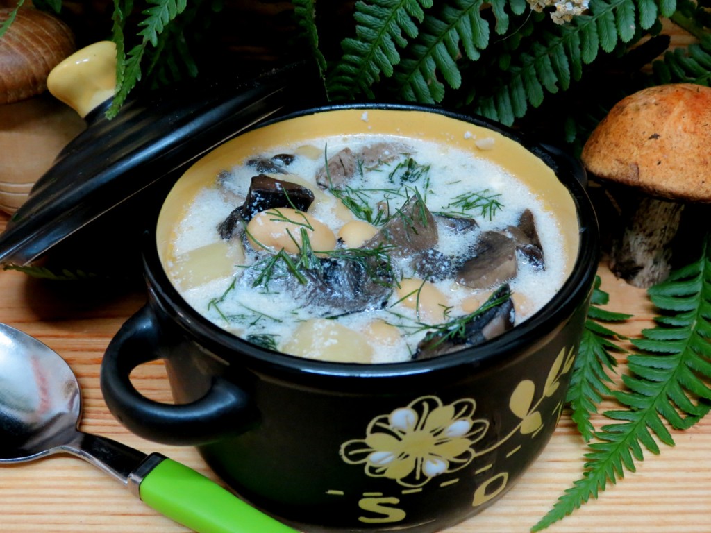Необыкновенно ароматный, вкусный суп, сваренный из свежих подосиновиков с картошкой, подаём со сметаной, посыпав, по желанию, мелко нарезанным укропом.