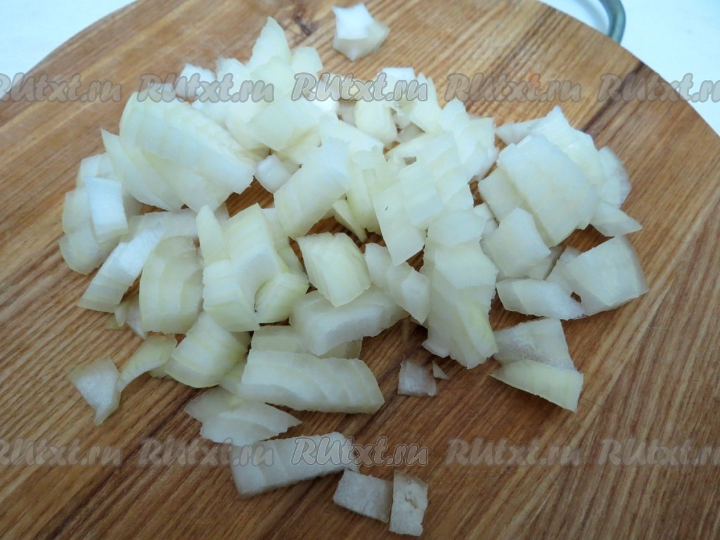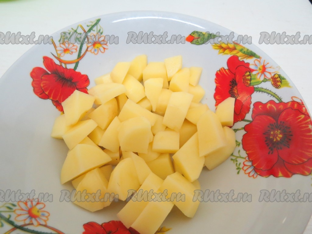 Картофель очищаем, нарезаем на средние кубики. В кастрюлю вливаем 2,5 литра воды, выкладываем нарезанный картофель и ставим на сильный огонь.