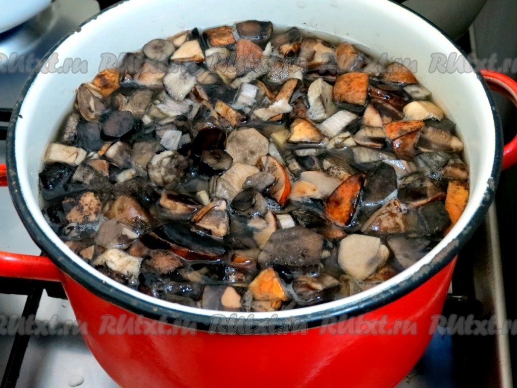 Как только вода в кастрюле с картошкой закипит, сразу выкладываем подготовленные подосиновики, даём ещё раз воде закипеть и, уменьшив огонь, варим 20 минут.