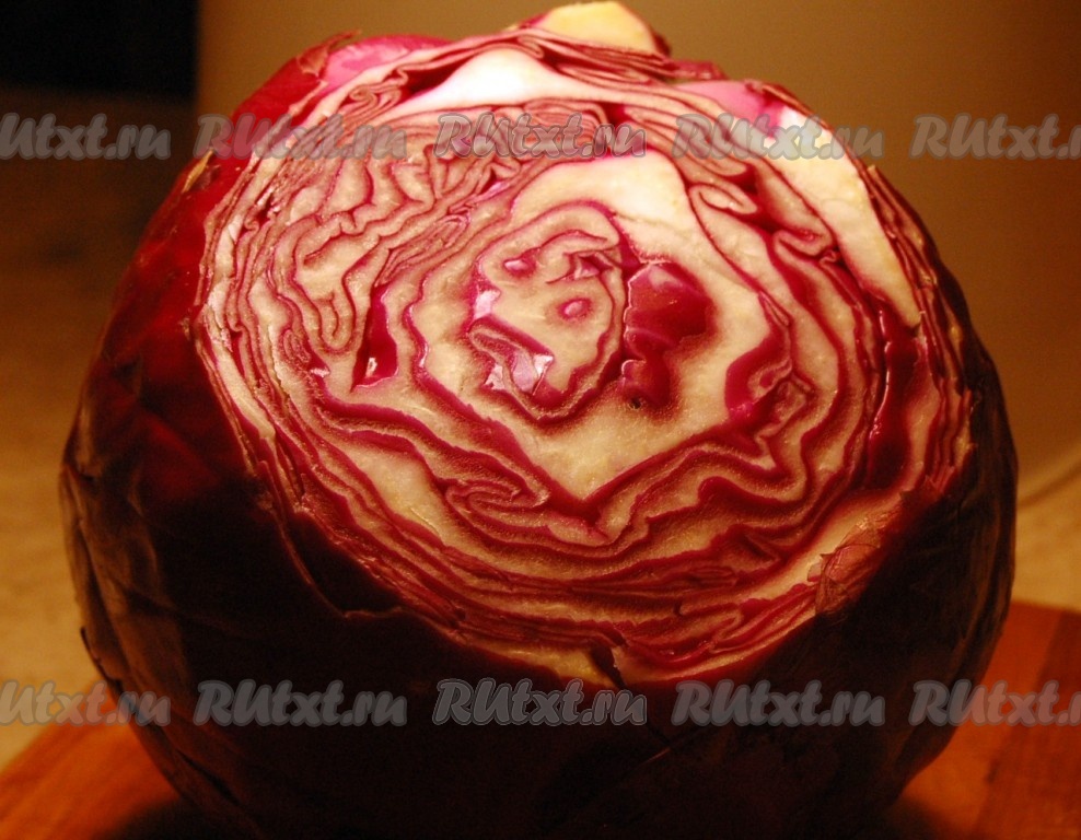 Возьмем миску и тонко настругаем в нее краснокочанную капусту.