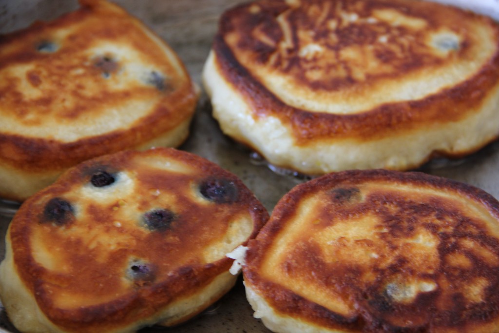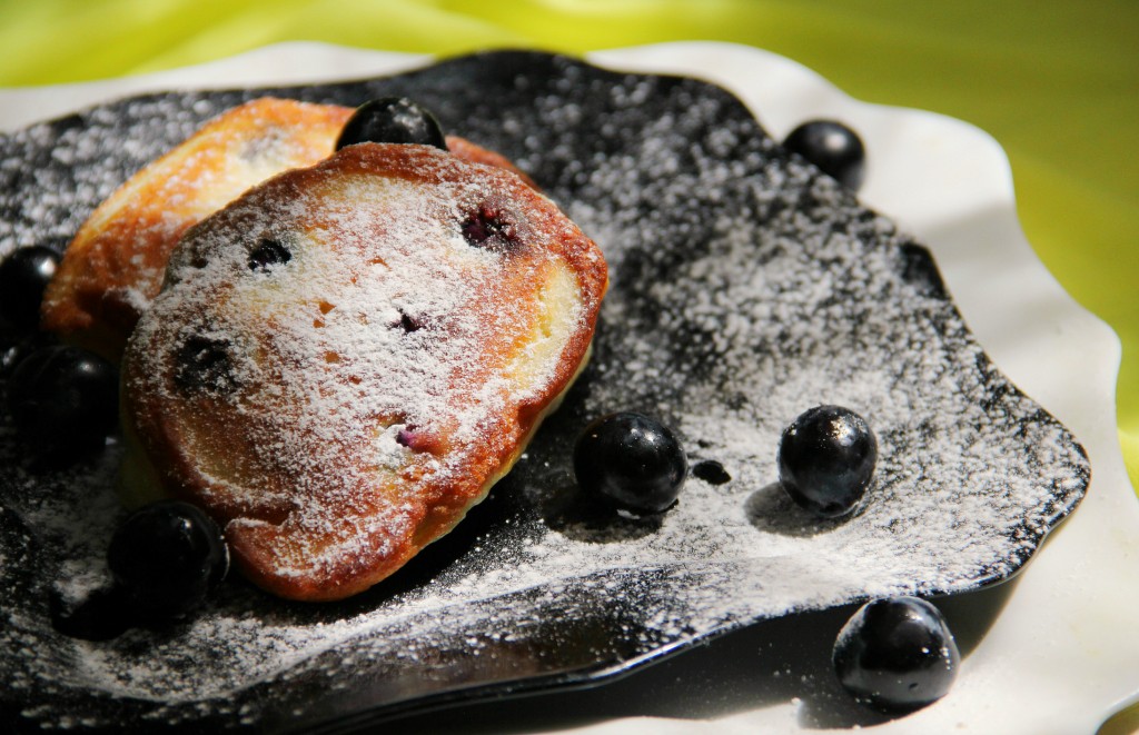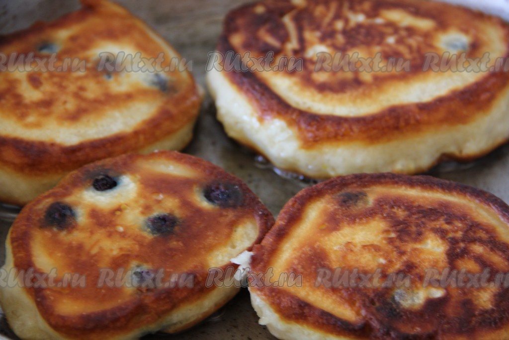 Наши вкусные, пышные оладьи с ягодами, приготовленные на кефире, можно подавать к столу.