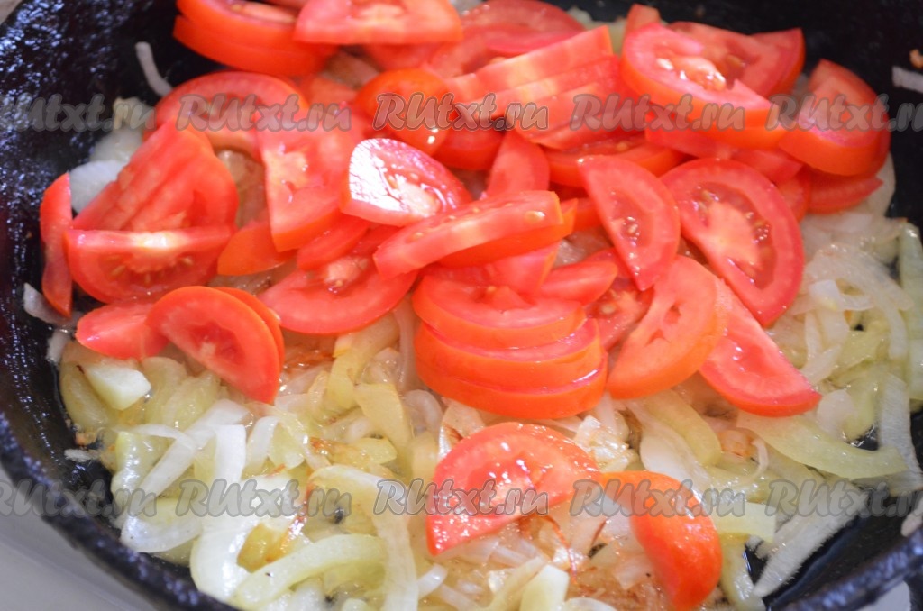 Затем добавить помидоры, перемешать. Жарить под крышкой 5-7 минут, помешивая.