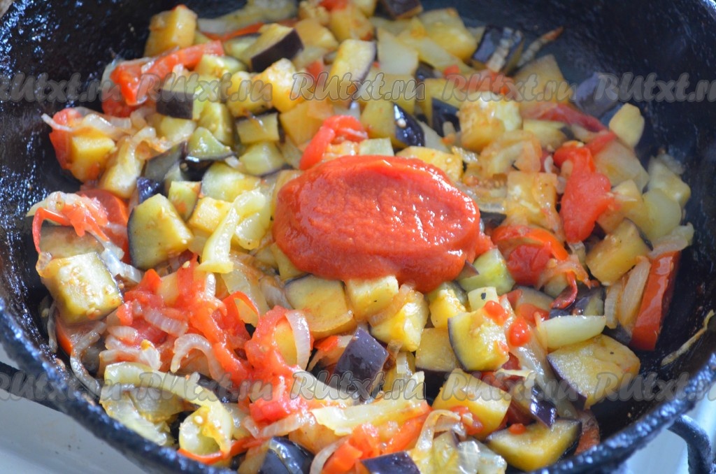 Теперь очередь томатной пасты. Ее можно добавить и немного больше, по вкусу. Перемешать.