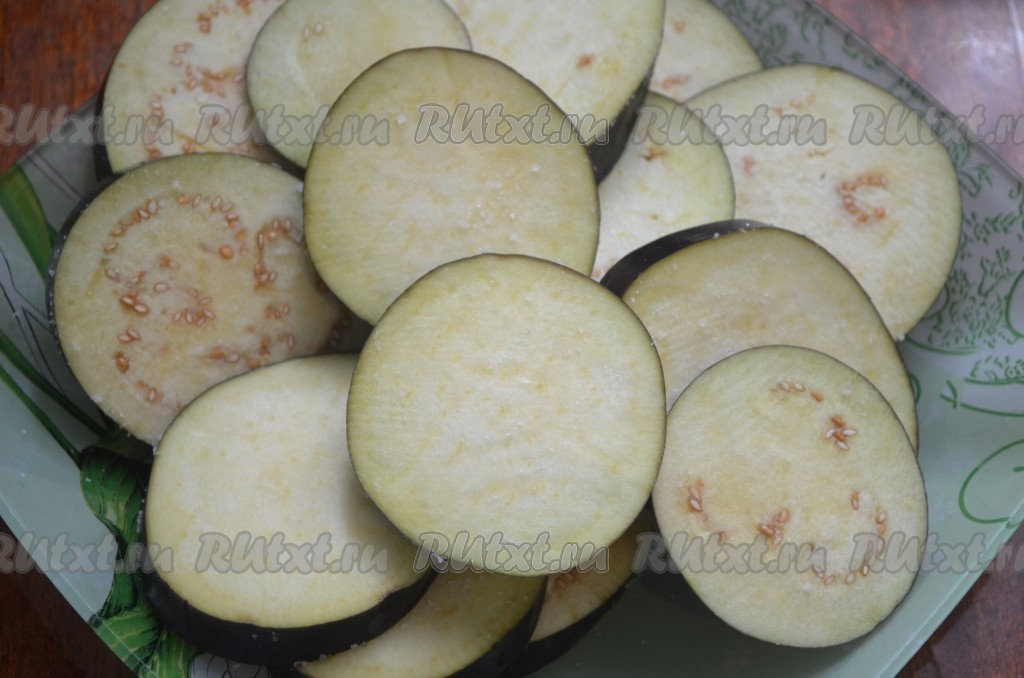 Баклажан помыть и нарезать кружочками толщиной примерно 5 мм. Посолить и оставить на 15 минут.