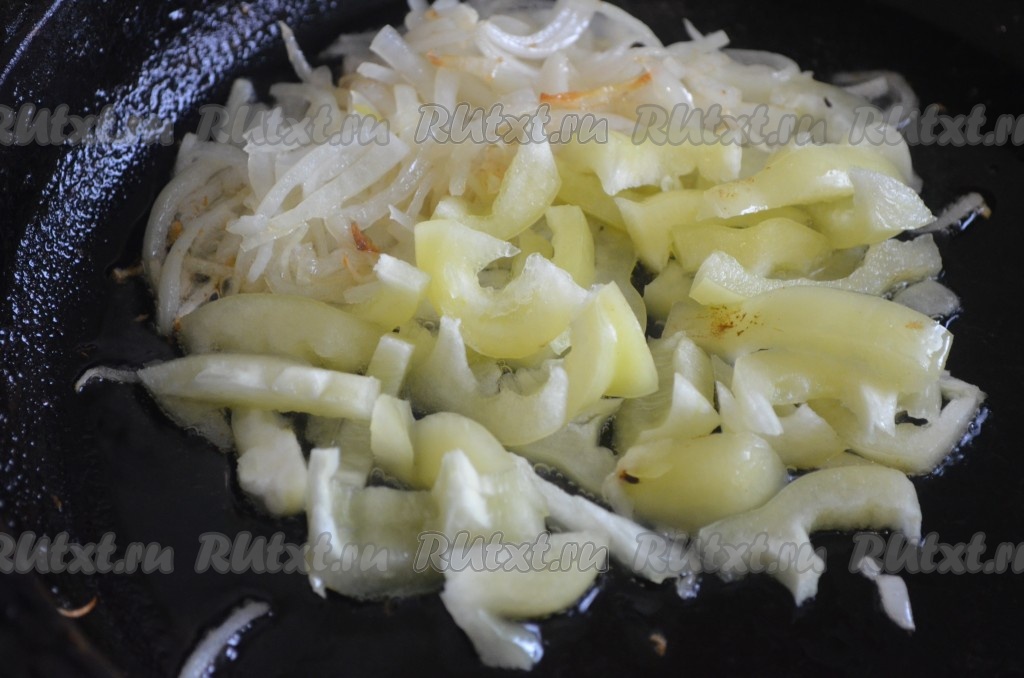 Обжарить лук до слегка золотистого цвета на масле, добавить перец болгарский, перемешать. Жарить под крышкой 5 минут, помешивая.