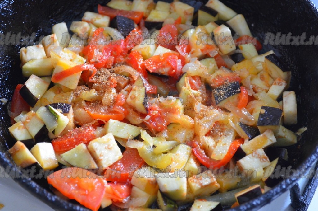 Дальше добавить баклажаны, сахар, специи (у меня - молотый кориандр и чёрный молотый перец), соль по вкусу, перемешать. Готовить 5-7 минут также под крышкой и помешивая.
