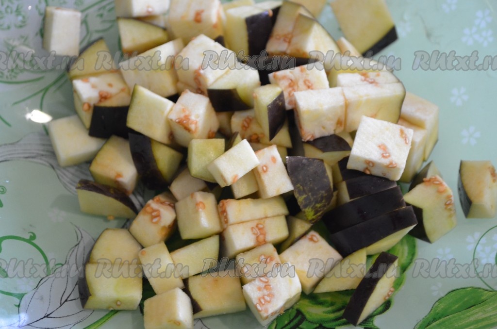 Затем баклажаны промыть, нарезать кубиками.